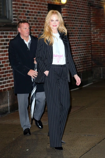Николь Кидман продолжает промоушн фильма «Плохая девочка», в котором сыграла главную роль. Поэтому она и надела простую белую футболку с названием картины, которую сочетала со строгим синим брючным костюмом и вертикальной полоской. Но даже если бы Николь не участвовала в рекламной кампании, то надеть футболку с костюмом — хорошая идея. Так образ выглядит более расслабленным, а еще помогает выглядеть моложе за счет современного вида.