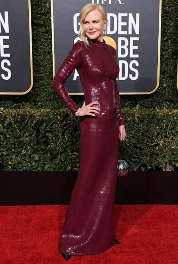Этот образ актрисы на красной дорожке «Золотого глобуса» очень напомнил костюмы из фильма «Аквамен», съемки в котором для Николь закончились совсем недавно. Облегающее платье макси глубокого бордового цвета с пайетками-«чешуйками» отлично оттенили мюли в матово-черном оттенке. Выбор клатча в форме серебряного шара тоже отличился оригинальностью.
