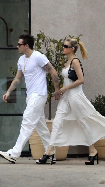 Молодожены Никола Пельтц и Бруклин Бекхэм проводят все свободное время вместе. Недавно звездная пара посетила маркет в Лос-Анджелесе. На шопинг Никола отправилась в легком сарафане молочного оттенка на тонких бретелях. К платью девушка подобрала черные мюли с открытым мысом и на очень высоком каблуке, небольшую сумку на плечо и самые модные солнцезащитные очки сезона.
