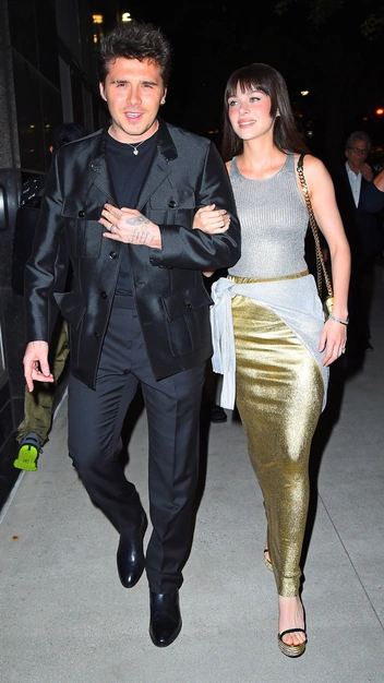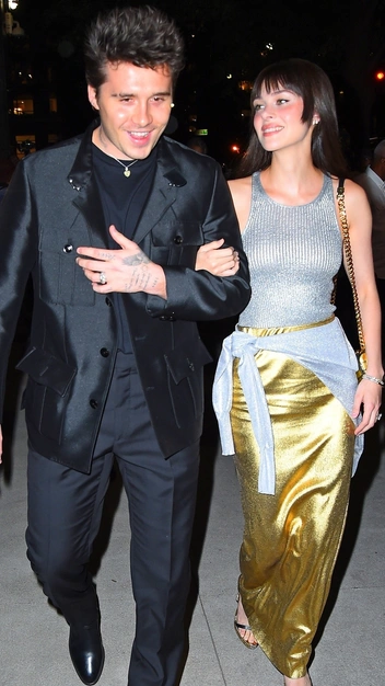 Блестящие ткани и пайетки теперь можно носить каждый день. Никола Пельтц, к примеру, выбирает золотую юбку длины макси, которую сочетает с серым топом и босоножками на высоком каблуке. Сделать наряд менее формальным помог повязанный на талии джемпер и сумка на длинной цепочке.