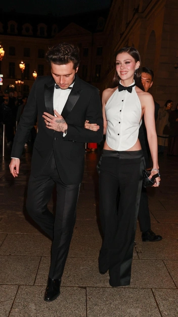 В последнее время Бруклин Бекхэм и Никола Пельтц редко выходят на публику, однако ради модного показа Виктории Бекхэм сделали исключение и посетили шоу. Никола продолжает следовать трендам нулевых: она примерила жилет, напоминающий по крою рубашку, и подобрала к нему брюки на низкой посадке. Завершили ее выход туфли на платформе, клатч, галстук-бабочка и украшения. Бруклин отдал предпочтение белой сорочке и черному смокингу.