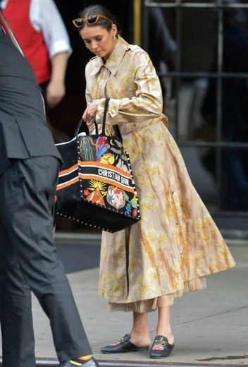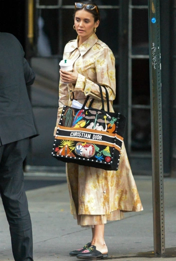 Звезда «Дневников вампиров» всегда отдает предпочтение однотонным лукам, а встретить ее в пестрящих или принтованых нарядах на улицах Нью-Йорка можно нечасто. Правда, на днях фотографам все-таки удалось запечатлеть актрису в довольно необычном для нее образе: Нина примерила бежево-желтый принтованый плащ, который дополнили мюли с ярким рисунком на плоской подошве и сумка Dior с броским принтом. Аутфит дополнили солнцезащитные очки и золотые серьги-кольца. Не уверены, что такой образ Нина примерила для обычной прогулки за кофе, ведь он просто создан для того, чтобы привлекать к себе внимание папарацци.