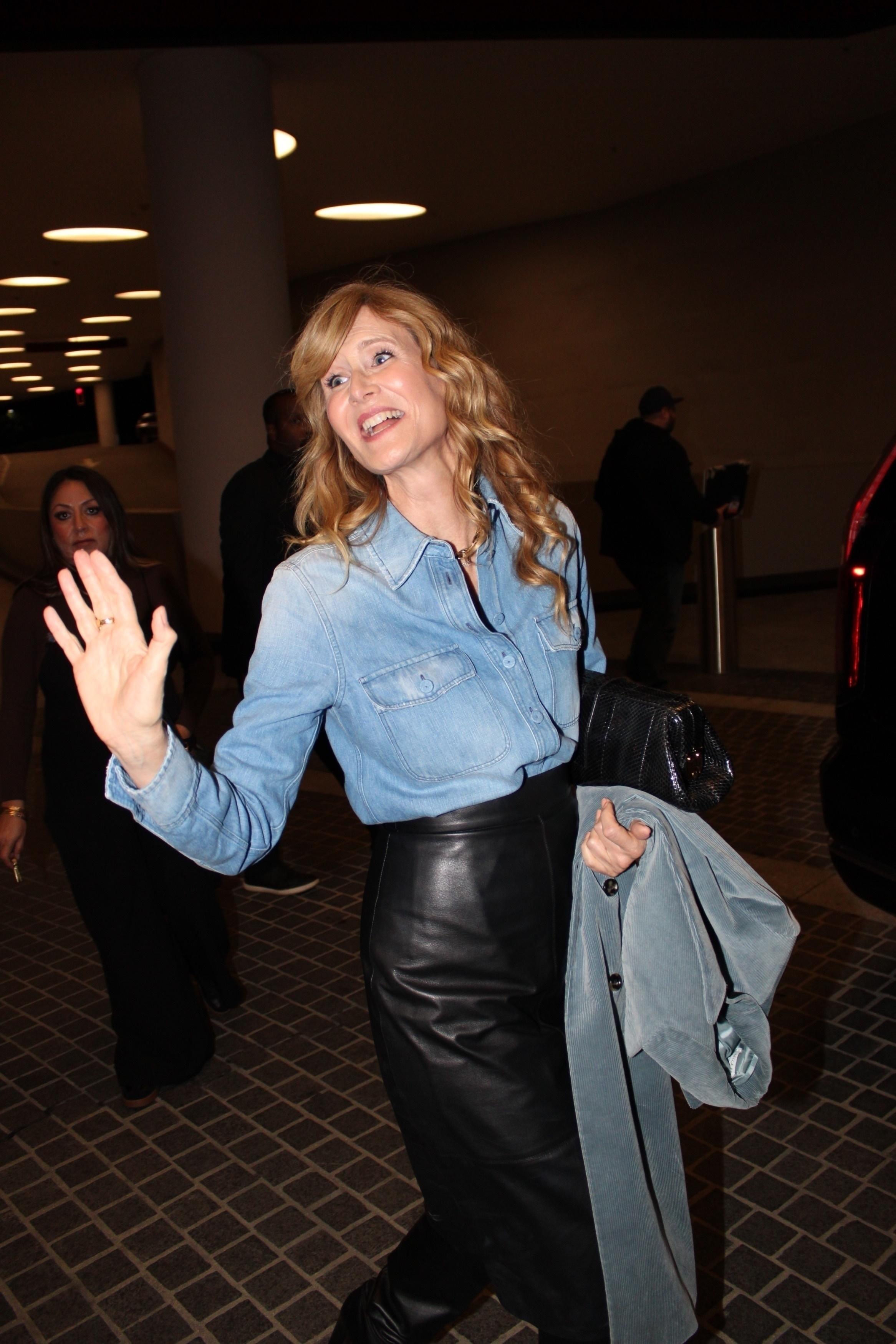 Голливудская икона стиля — Лора Дерн — мастерски переосмысляет классику: деним в дуэте с гладкой кожей выглядит актуально и элегантно вне времени. Секрет образа в балансе текстур и лаконичных деталей: голубая рубашка, юбка-карандаш, черные сапоги и неброские аксессуары. Такой вариант — идеальная формула для светского вечера или городских будней, когда хочется добавить чуть больше характера привычным вещам. И именно джинсовая рубашка играет в этом аутфите роль стильной точки отсчета, вокруг которой собирается весь остальной образ.