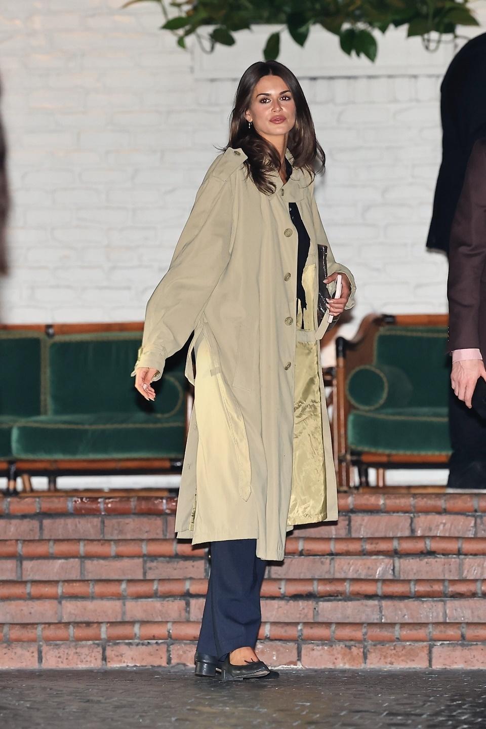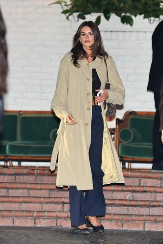 Кайя Гербер переосмысляет Glamoratti по‑своему: вместо графичных силуэтов и неона — минималистичный образ в духе восьмидесятых. Хаки‑тренч с мягко спущенным плечом, темный топ на пуговицах и широкие брюки мужского кроя становятся мгновенной отсылкой к power dressing той эпохи, но без лишнего пафоса. И, конечно, не обошлось без любимой пары модели — классчисеких мэри-джейн, с которыми она не расстается практически никогда.