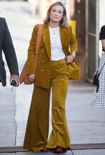 И нет, не от Блейк Лайвли. Вельвет и насыщенный горчичный оттенок станут идеальным сочетанием для яркого образа в этом сезоне, а расклешенная макси-модель брюк только добавит ему колоритности.