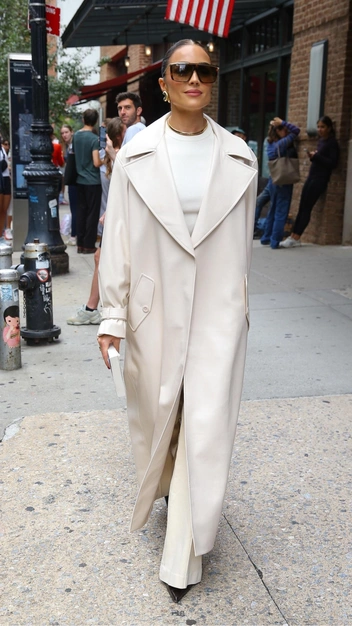 Хотите знать, какой цвет выбирают для своего гардероба состоятельные и успешные женщины? Взгляните на новый образ Оливии Калпо: знаменитость оделась в оттенки белого, которые всегда смотрятся роскошно. Она примерила базовый топ в сочетании с костюмными брюками со стрелками и дополнила элегантный выход безупречным пальто в длине макси. Завершили его акцентные черные туфли, крупные очки и золотые украшения.