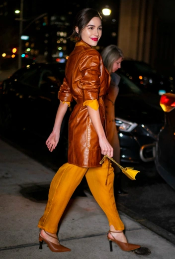 Образ почти что с подиума: этой весной не забываем составлять комбинации из разных фасонов в насыщенных оттенках. К слову, коричневый и янтарный смотрятся вместе ну очень соблазнительно, а тонкие материи в сочетании с кожей — то, что завещали нам дизайнеры своими модными показами еще в прошлом году.
