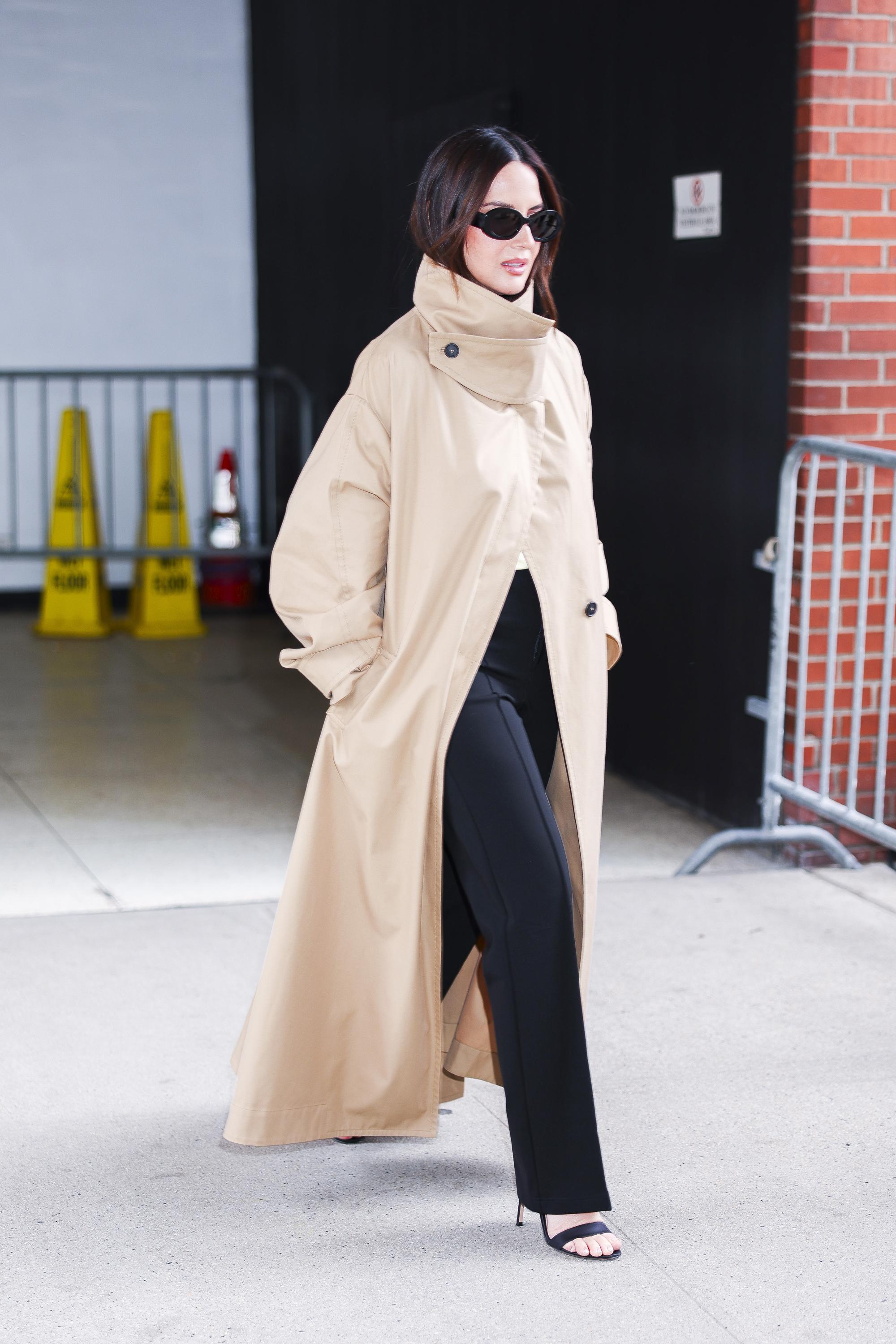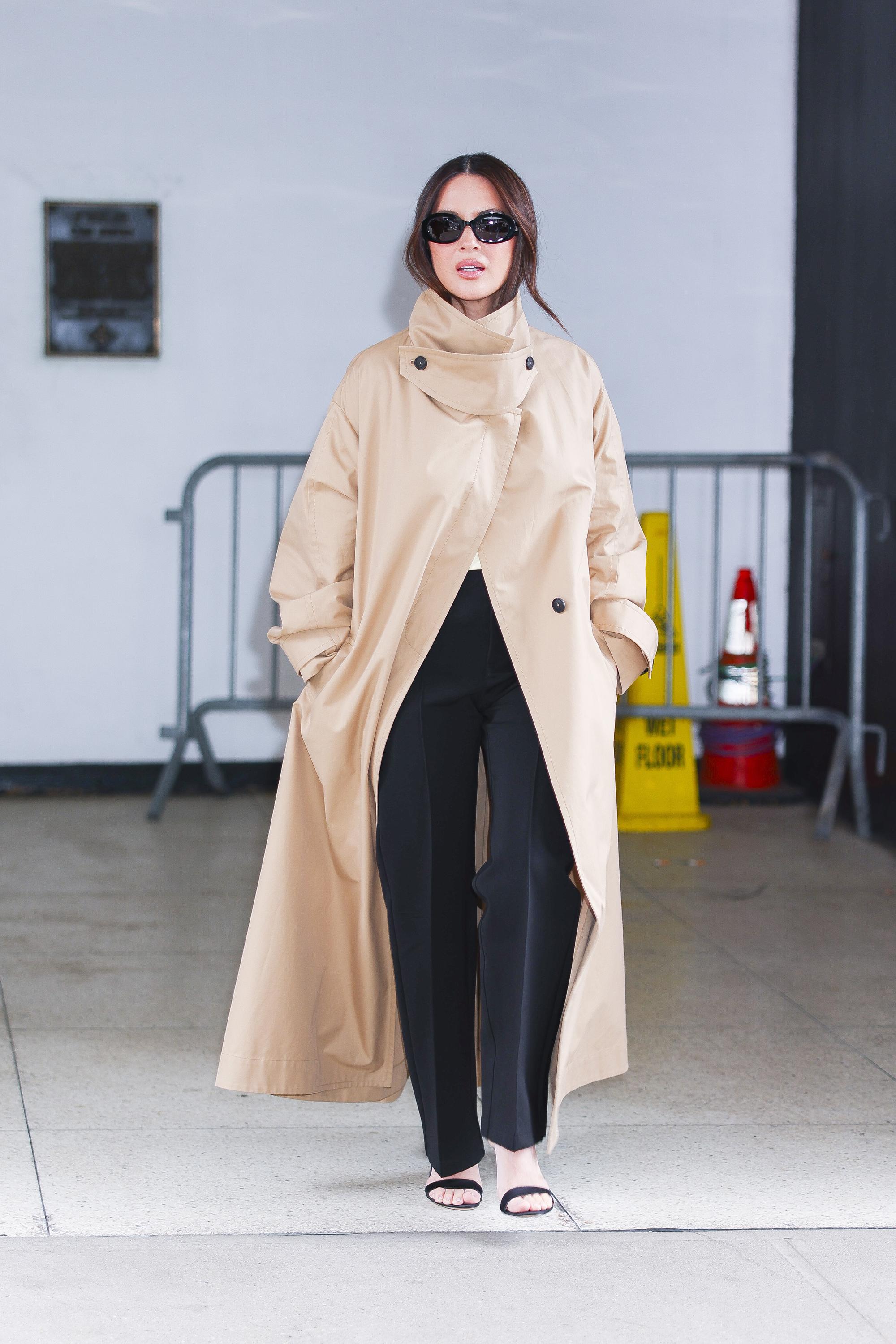 Бежевый плащ с объемным воротником‑стойкой — это современная интерпретация классического тренча, в которой все внимание уходит в архитектуру верха, а асимметричная линия застежки делает силуэт максимально графичным. В паре с черными прямыми брюками, минималистичными босоножками и крупными солнцезащитными очками плащ превращается в самостоятельного героя образа — тот самый универсальный верхний слой, который одинаково уместен и поверх вечернего платья, и поверх строгого офисного костюма.