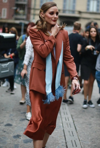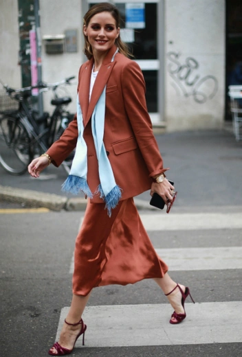 В Милане желание выглядеть на все сто, а тем более во время Недели моды, — абсолютно естественное желание. А вот для фэшн-инфлюенсеров оно становится профессиональной обязанностью: Milan Fashion Week превращает улицы модной столицы Италии в настоящие подиумы, по которым уверенно дефилируют стильные девушки, образы которых часто мелькают в инстаграм-ленте (запрещенная в России экстремистская организация). Среди них особенной популярностью и любовью модниц пользуется Оливия Палермо. Для показа Max Mara SS20 девушка примерила комбинацию в карамельном оттенке с шелковым летящим низом и классическим жакетом в тон. Наряд эффектно дополнил светло-голубой шарф с бахромой и босоножки на каблуке в тон.