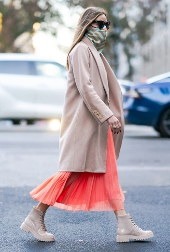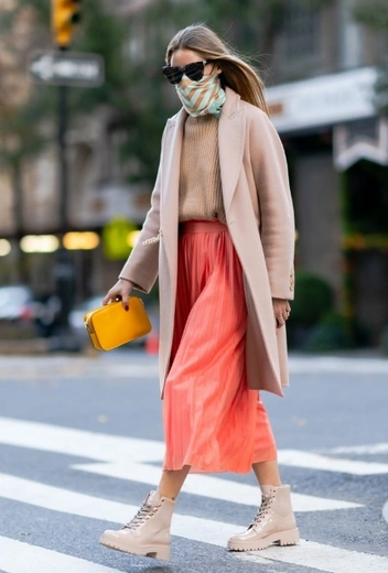 Колор-тенденции сменяют друг друга очень быстро, но некоторым из них все же удается получить статус вневременных трендов на просторах звездного стритстайла. Безусловным фаворитом знаменитостестей стал оттенок Living Coral, который был объявлен цветом прошлого года по версии Pantone. Впрочем, это не мешает ему продолжать жить в гардеробах модниц и сегодня. Так, для осеннего стритстайла инфлюенсер и бизнесвумен Оливия Палермо подбирает эффектный лук с длинной плиссированной юбкой в коралловом оттенке, которую дополняют коричневый свитер, нюдовое пальто, ботинки в тон верха и темно-желтый клатч.
