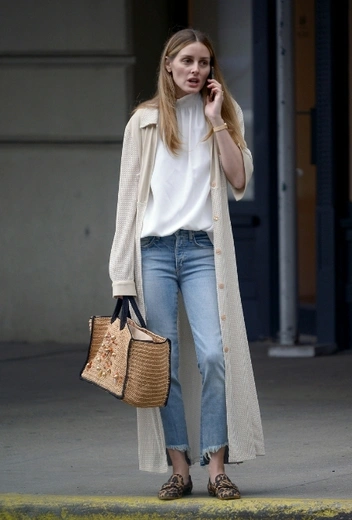 Оливии Палермо известно большое количество фэшн-рецептов, как придать повседневному образу максимальный комфорт и практичность. Летний casual-вариант от Оливии может включать сочетание базовых и акцентных вещей в самых разных стилях — таким образом она добивается максимальной органичности стритстайл-выхода. Для деловой прогулки по городу звезда выбирает комбинацию с бежевым кардиганом, джинсами, белой блузой и лоферами в леопардовой расцветке. Образ удачно дополняет плетеная сумка-тоут в круизном стиле.