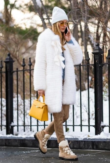 В разгар холодного сезона изделия из искусственного меха становятся одними из самых нужных вещей в сезонном гардеробе. Этой зимой фэшн-инфлюенсеры активно используют мех как в верхней одежде, так и в обуви и применяют не только в повседневных луках, но и в деловых. Универсальную идею для последнего предлагает Оливия Палермо — один из самых видных фэшн-инфлюенсеров Нью-Йорка. Звезда выгуливает комбинацию с коричневыми клетчатыми брюками и голубым свитером, дополненную шубой из белого искусственного меха, ботинками на меху и шапкой в тон верха. Лук завершают желтая сумка и очки с полупрозрачными линзами.