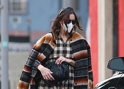 Американская актриса показывает стильный вариант брючного образа в клетку для холодного сезона.