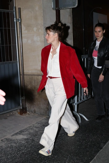 Кристен Стюарт сейчас проводит много времени во Франции: там она снимается в фильме Full Phil вместе с Вуди Харрельсоном. И, кажется, актриса настолько прониклась атмосферой Парижа, что случайно (или нет!) надела образ в цветах французского флага. Красный бархатный пиджак поверх свободной белой рубашки и широких брюк, застегнутых красным кожаным ремнем, а на ногах белые кроссовки Adidas с красно-синими полосками. Образ сочетает в себе американскую легкость и французскую чувственность — идеальный вариант для повседневного аутфита.