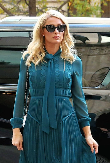 Когда-то Пэрис Хилтон сделала своим фирменным цветом розовый, и долгое время мы ассоциировали ее только с этим оттенком. Однако со временема она начала чаще эксперимнетировать со стилями и делать выбор в пользу других, более необычных оттенков. В новом образе звезда решила взять за основу приятную палитру морской волны и выбрала женственное платье миди, дополненное плотными черными колготками и лакированными босоножками.