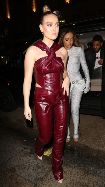 Перри собрала модный лук для праздничного вечера в компании друзей. На вечеринку солистка группы Little Mix отправилась в костюме, но классическому комплекту с жакетом и брюками предпочла модель с топом-халтер из кожи винного оттенка. Эффектный аутфит Перри дополнила нюдовыми босоножками и забранными наверх волосами в стиле 2000-х.