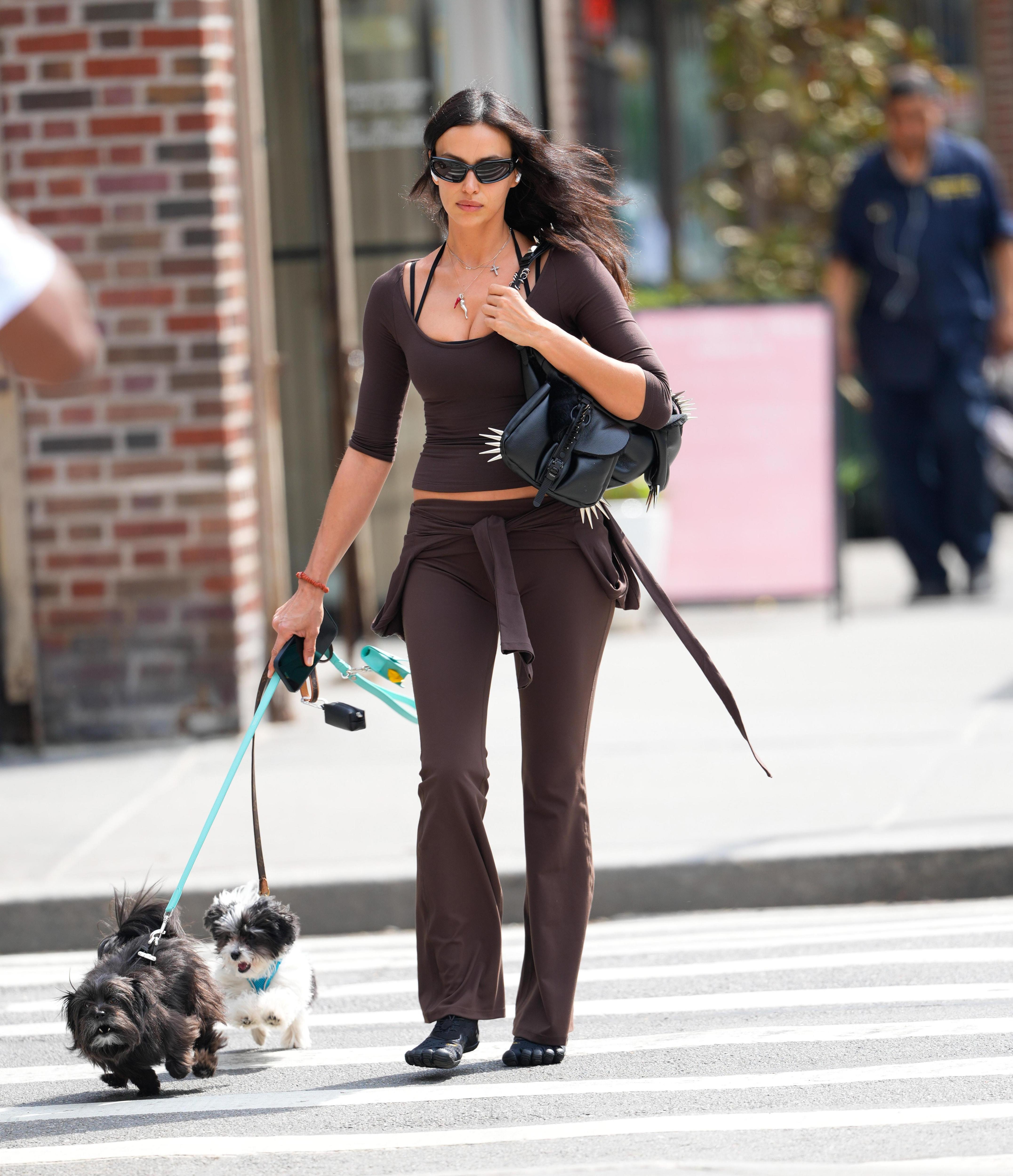 Ирина Шейк часто становится героиней Нью-Йоркского стритстайла. На этот раз модель появилась на улицах мегаполиса в образе, явно вдохновленном эстетикой pilates girls. Для прогулки с собаками она выбрала облегающий спортивный костюм в трендовом шоколадном оттенке. Правда, и в этом аутфите угадывается фирменная дерзость Шейк: нежность развенчивает рюкзак с шипами, массивная подвеска в виде перчиков чили и кроссовки barefoot. Тренд на ugly shoes по-прежнему остается с нами.