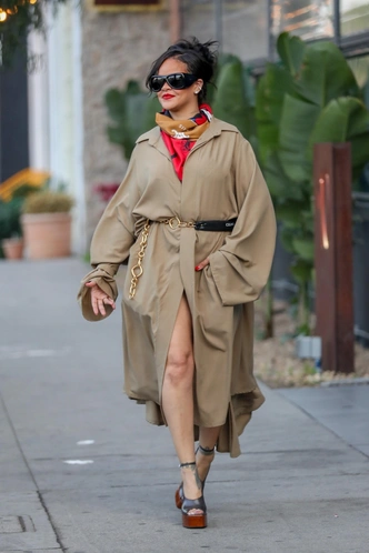 Рианна превращает деловую встречу в мини‑подиум, выходя на улицы Лос‑Анджелеса в песочном оверсайз‑тренче, который носит она как платье. Певица подчеркнула талию тонким ремнем с тяжелой золотой цепью, но решила не останавливаться на одном акценте и добавила к аутфиту шелковый платок в красно‑карамельных тонах, массивные босоножки в духе 70‑х и крупные темные очки — все они собирают образ голливудской дивы воедино и в очередной раз доказывают, кто главная фэшн-икона современности.