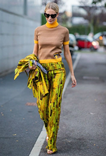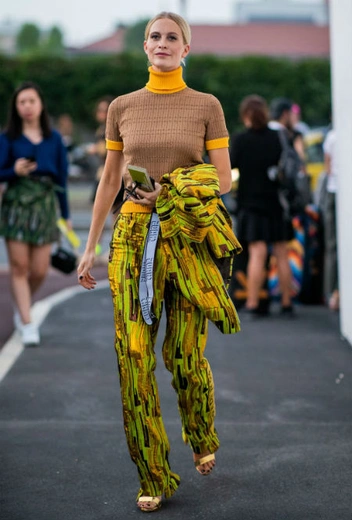 Tie-dye прекрасно раскрывается в ярких цветовых гаммах: например, в зелено-желтой, как в образе Поппи. А еще выигрышней наряд с tie-dye будет смотреться, если добавить в него элементы из другой материи, отличные по фасону: такой контраст спасет вас от неудачной комбинации в виде расплывчатой радужной капли.