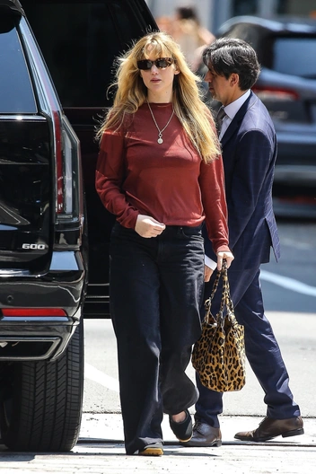 Так, актриса надела джинсы прямого фасона оверсайз в темном цвете, который всегда визуально стройнит фигуру. А также облегющий бордовый лонгслив — несмотря на недавние роды, Дженнифер уже приходит в форму.