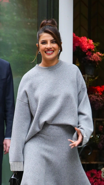 Приянка Чопра нашла необычный серый костюм, в котором гармонично сочетаются женственность и спортивный стиль. Так, верхом образа стал расслабленный свитшот со спущенными плечами, манжеты которого украшены стразами. Низ же, напротив, оказался элегантным — индийская актриса выбрала расклешенную юбку на широком поясе. Дополнила она изящный образ белоснежными сапогами и небольшой черной сумкой.