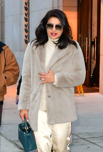 Тотал-лук в одном цвете – один из любимых приемов Приянки Чопры. Однако актриса и супруга Ника Джонаса часто не только подбирает цвета тон в тон, но и играет с разными оттенками одной палитры. Например, сочетая кремовые сатинированные брюки-джоггеры, светлый свитер и бежево-серое меховое пальто.