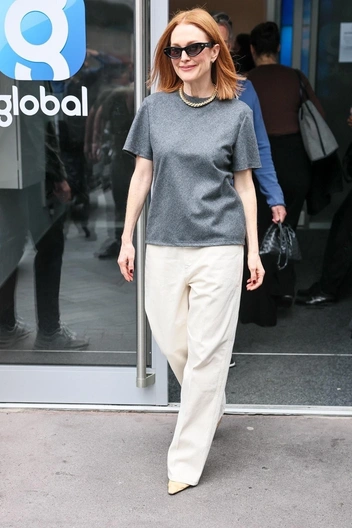 Совсем скоро выйдет сериал «Долина эха» с Джулианной Мур и Сидни Суини в главных ролях, а пока актрисы занимаются продвижением картины. Они чаще выходят на публику и составляют стильные образы. Один из последних от Джулианны — с бежевыми прямыми брюками и простой серой футболкой. Выход завершили лодочки с острым мысом в сливочно-желтом оттенке, а также солнцезащитные очки формата cat eye.