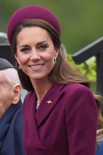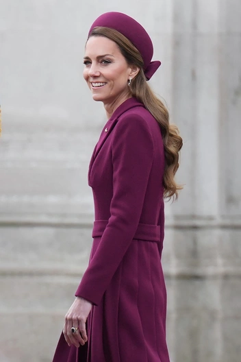 Сейчас речь о платье-пальто Catherine Walker, которое принцесса Уэльская надела для парада в честь 80-летия со дня окончания Второй Мировой войны. Будущая королева уже надевала его несколько лет назад, но по случаю встречи президента ЮАР. Образ приглушенного оттенка фуксия дополнила шляпка с бантом сзади, а также украшения — на этот раз принцесса выбрала рубины. Кроме того, помолвочное кольцо Кейт с сапфиром было на месте — в последнее время принцесса носила вместо него другое, от Tiffany & Co. Завершением образа стала укладка с крупными локонами — мы давно заметили, что Кейт сменила цвет волос, и еще раз убедились в этом.