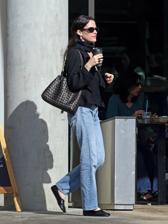Райли Кио выглядит как героиня инди‑фильма, вышедшая за утренним кофе: свободная черная рубашка, небрежно повязанный шарф в тон и прямые светло‑голубые джинсы собирают расслабленный, но очень кинематографичный силуэт. Черные балетки и плетеная макси-сумка Bottega Veneta на плече добавляют к этому луку немного французского настроения, так что обычный поход в книжный и за латте превращается в готовый референс для капсулы — «как одеться, когда ничего не хочется придумывать, но нужно выглядеть эффектно».