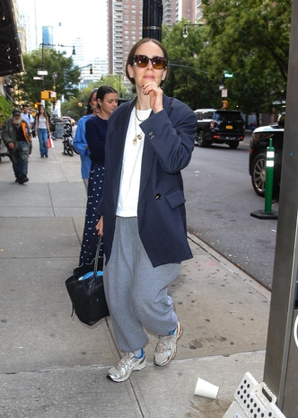 Любимое комбо модных девушек — это спортивные брюки с пиджаком, и Сара Полсон не стала исключением. Актриса прошлась по Нью-Йорку в этих двух, казалось бы, разных, но идеально сочетающихся вещах. Сара предпочла пиджак темно-синего оттенка с мужского плеча, надев его с мешковатыми антрацитовыми брюками и беговыми кроссовками. В руке — объемная сумка, в которую помещается все, что нужно, и вы готовы к деловой встрече.
