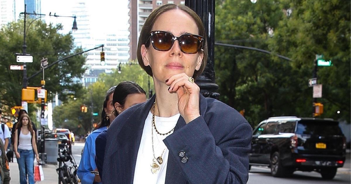 Любимое комбо модных девушек — это спортивные брюки с пиджаком, и Сара Полсон не стала исключением. Актриса прошлась по Нью-Йорку в этих двух, казалось бы, разных, но идеально сочетающихся вещах. Сара предпочла пиджак темно-синего оттенка с мужского плеча, надев его с мешковатыми антрацитовыми брюками и беговыми кроссовками. В руке — объемная сумка, в которую помещается все, что нужно, и вы готовы к деловой встрече.