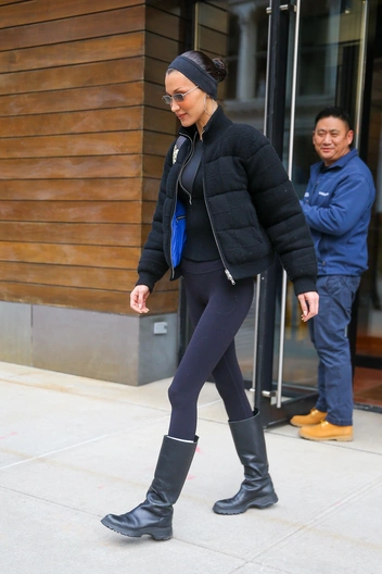 Белла Хадид попала в объективы папарацци, когда покидала свои апартаменты в Нью-Йорке. Она подобрала спортивный образ с черными легинсами и облегающей кофтой. Сверху Белла надела укороченную куртку, а завершили образ черные сапоги. Простой, но стильный лук завершила повязка на голову, которая удобна при физических нагрузках.