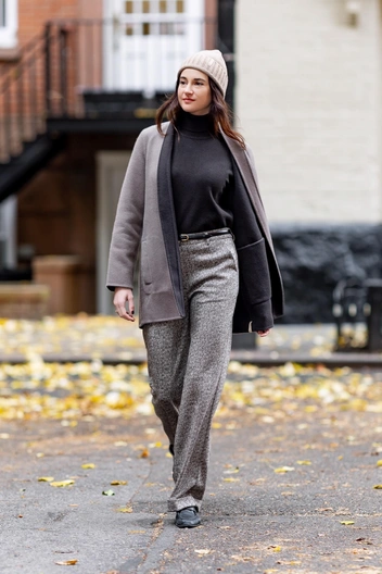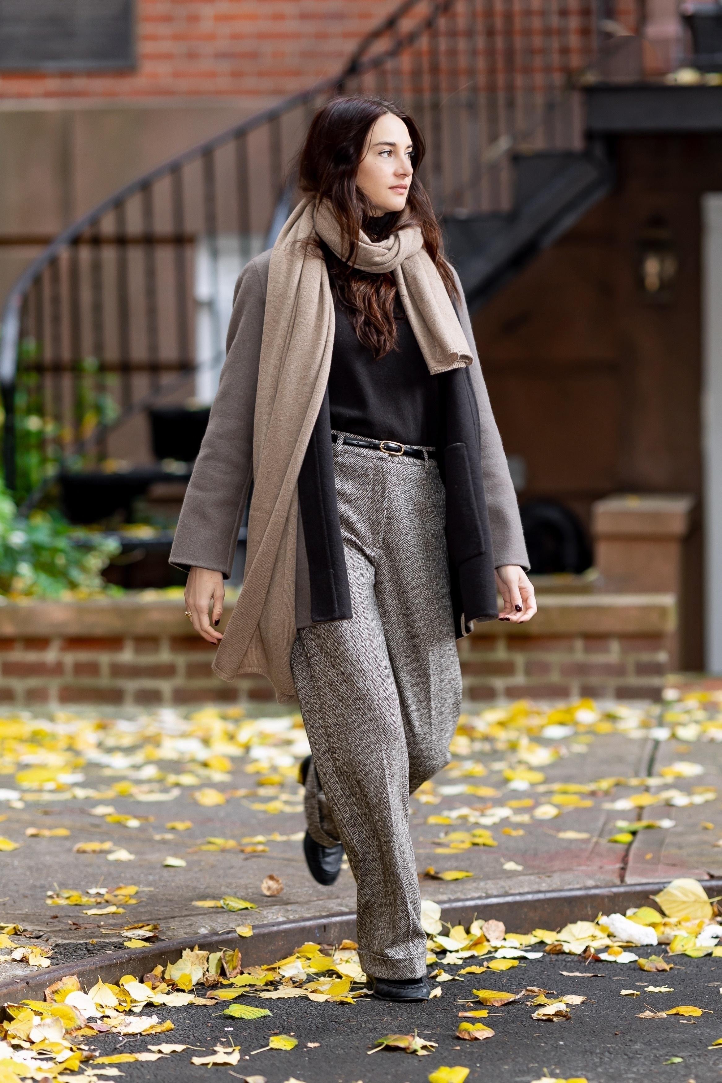Шейлин Вудли выбирает ту самую правильную базу для зимнего образа городе — теплую, комфортную и абсолютно ненавязчивую. В комплекте от бренда Falconeri: мягкое кашемировое пальто приглушенного бежевого оттенка, теплый шарф и шапка в тон, а также темный базовый джемпер — актриса демонстрирует идею «тихой роскоши» без единой показной детали. Широкие брюки добавляют аутфиту текстуры и легкого ретро-настроения, а тонкий ремень аккуратно обозначает талию. Это тот случай, когда зимний стритстайл селебрити превращается в учебник по расслабленному, но дорогому повседневному шику.