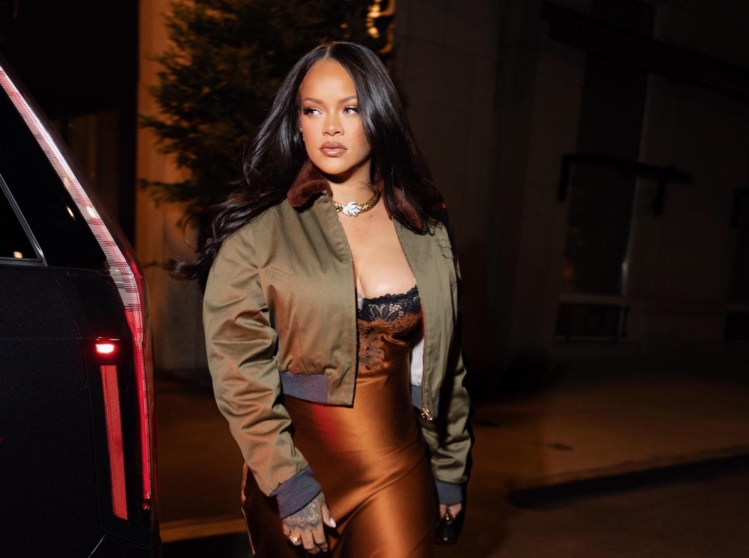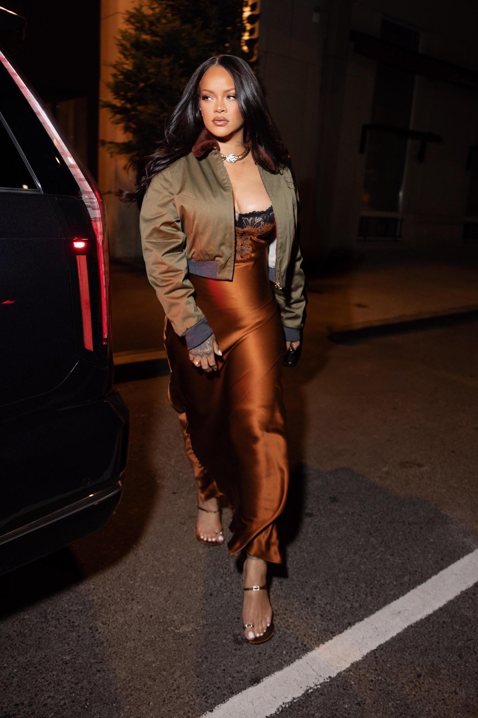 Рианна посетила мероприятие в темно-оранжевом сатиновом платье, в котором главный акцент — романтичное будуарное кружево. Оно буквально «стекает» по фигуре и ловит каждую вспышку камеры, превращая певицу в настоящую голливудскую диву. Сверху — укороченный милитари‑бомбер, как фирменный рианновский «антидресс‑код»: грубоватая куртка намеренно «сбивает» глянец, делает образ менее предсказуемым и еще более желанным, а минималистичные золотые босоножки и ожерелье только подчеркивают, что главное здесь — это сияющее платье, которое задает новую планку для ее последовательниц.