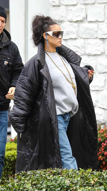 Рианна отправилась на шопинг в ультрамодном образе. Звезда надела удлиненный свитшот с разрезами по бокам, широкие голубые джинсы и дополнила выход объемным пуховиком макси. Акцент певица сделала на деталях: массивных ботинках в синем оттенке, разноцветной сумке Louis Vuitton, крупной цепи и очках-маске.