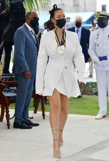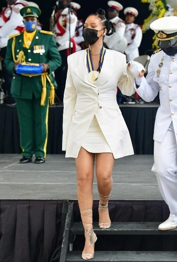 Накануне в барбадосском Бриджтауне состоялось торжественное мероприятие в связи с выходом Барбадоса из-под крыла Соединенного Королевства и обретением им независимости. По случаю знаковой даты на родину прилетела певица Рианна, которую объявили национальным героем Барбадоса за особенные заслуги в популяризации страны за рубежом. На церемонии награждения звезда блистала в комбинации в total-white с мини-платьем, удлиненным жакетом и босоножками на высоких завязках. Аутфит дополнили лаконичные украшения и прическа с плетеными косичками в афро-стиле.