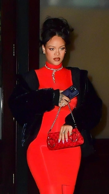 Красный цвет стал самым популярным на прошедших Неделях моды осень-зима 2023/24, и звезды постепенно внедряют в свой гардероб огненный оттенок. Рианна же показала самый смелый образ, который мы от нее и ждали: она появилась в красном тотал-луке. Певица надела облегающее алое платье, которое плавно перетекает в брюки. К аутфиту она подобрала сумку Gucci винтажной модели, босоножки и черную кофту, декорированную мехом. Завершили безупречный выход украшения: крупное колье и лаконичные серьги.