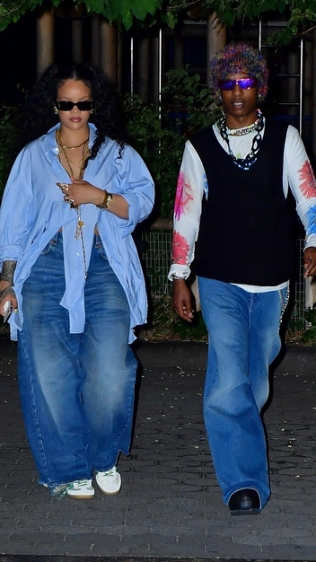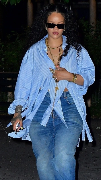 Если во время беременности Рианна носила минимум одежды и открытый живот, то после рождения первенца певица отдает предпочтение вещам свободного кроя. Фотографы встретили звезду в Нью-Йорке во время прогулки с возлюбленным. Рианна надела широкие джинсы-трубы и голубую oversize-рубашку с разрезами. Прекрасным завершением стильного и комфортного лука стали кроссовки солнцезащитные очки.