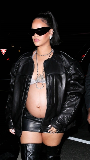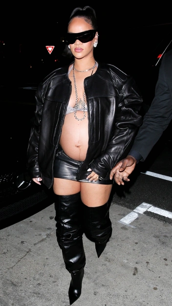 После того, как Рианна публично заявила о своей беременности в самой эффектной манере, певица не перестает удивлять поклонников своими броскими выходами, задавая моду для беременных. Звезда развеяла все мифы о том, как нужно одеваться девушкам в положении: каждый новый образ знаменитости сопровождается каблуками, обтягивающим топом и обязательно открытым животом. Недавний выход селебрити стал одним из самых провокационных: Рианна облачилась в кожаный тотал-лук с очень короткой юбкой, бра вместо топа, объемной курткой, все — Alexander Wang, а также в высокие ботфорты со сборкой Amina Muaddi. Аутфит завершили очки-маска в футуристичном стиле из коллаборации Coperni и Gentle Monster.