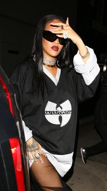 После объявления о беременности поклонники Рианны вновь стали следить за каждым ее выходом, ведь все они эффектные и ультрамодные. На этот раз певица появилась в трикотажном платье с V-образным вырезом в спортивном стиле. Кажется, она накинула его поверх полупрозрачного сарафана, который женственно прикрывает ноги. Завершила звезда образ по традиции украшениями и аксессуарами: она выбрала блестящий чокер, массивные перстни, босоножки и трендовые очки.