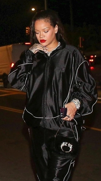 Давно мы не рассматривали беременные луки звезды, и вот она вновь появилась в эффектном вечернем образе. Рианна надела свободный спортивный костюм, состоящий из куртки и широких брюк с акцентными белоснежными полосками, и стилизовала его с босоножками и меховой сумкой. Главными в выходе стали алая помада и украшения: часы, браслет и цепь из крупных звеньев.