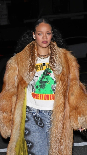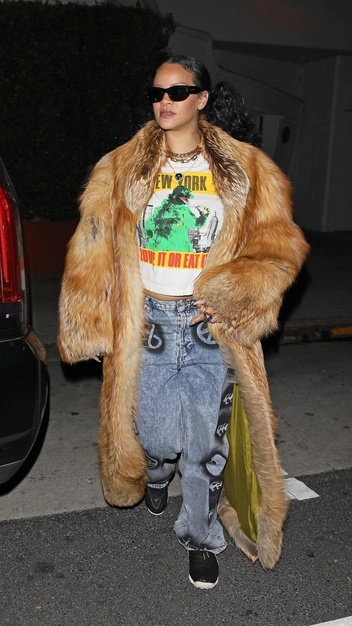 Совсем недавно на выступлении Super Bowl Рианна эффектно объявила о своей новой беременности и заставила всех поклонников ждать последующее ее появление. Для публичного выхода она выбрала свободную белую футболку с принтом, мешковатые джинсы и кроссовки. Но привлекла наше внимание длинная оверсайз шуба, которая всем так необходима в суровую зиму. Завершила образ Рианна серьгами, цепями и кольцами.