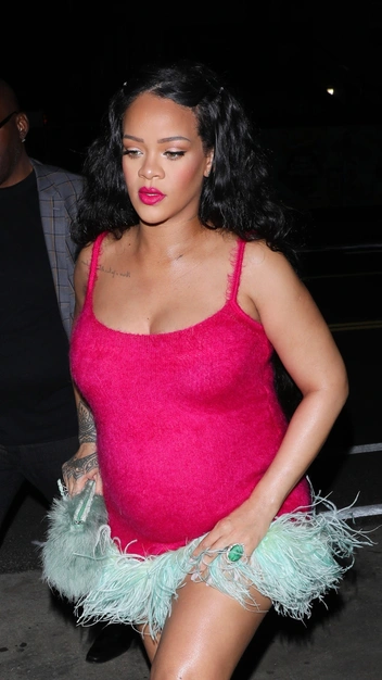 Мы давно привыкли к экстравагантным аутфитам Рианны: ожидая ребенка, певица не устает развеивать мифы о гардеробе беременных. На этот раз звезда обошлась без обнаженного живота, но открыла ноги. Рианна выбрала короткое платье насыщенного малинового оттенка Saint Laurent с контрастной отделкой на подоле из цветных перьев. Образ завершили мятные лодочки и меховой клатч.