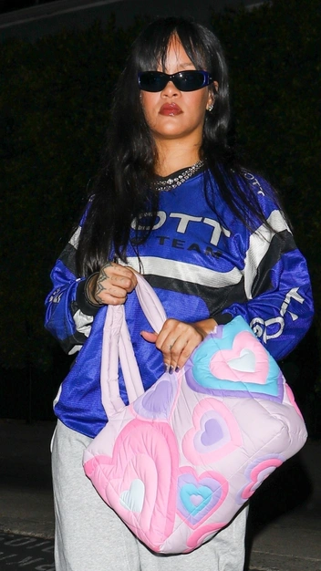 Рианне удается выглядеть роскошно даже в спортивных брюках и футболке. все дело в правильно подобранном крое и аксессуарах. Так, певица облачилась в серые джоггеры свободного кроя и oversize-футболку с принтом синего цвета. Завершили наряд солнцезащитные очки, кроссовки и вместительная сумка мягкой формы конфетных тонов.