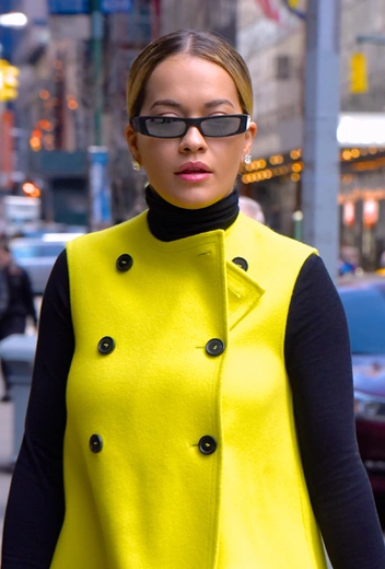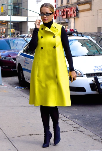 Как сочетать неоново-желтое пальто без рукавов самым безопасным образом? Отвечает Рита Ора: певица добавляет к нему черную водолазку, черные ботильоны и черные узкие очки прямоугольной формы. Лаймовый желтый и черный — одно из самых модных сочетаний весны, так что советуем запомнить эту нехитрую схему. Пригодится!
