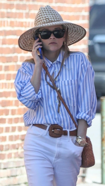 Первый выход Риз Уизерспун после объявления о разводе получился расслабленным и стильным. Знаменитая актриса надела объемную рубашку в полоску, у которой она закатала рукава, и прямые белые джинсы с необработанными краями. Аксессуары и обувь Уизерспун подобрала в коричневом цвете, выбрал ремень с широкой пряжкой, сумку и босоножки. Изюминкой образа стала широкополая шляпа-федора.
