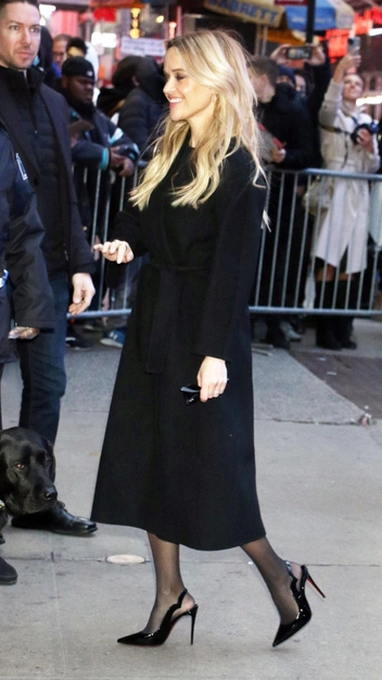 Для мероприятий звезда часто выбирает черный, ведь в нем девушки всегда выглядят великолепно. Риз Уизерспун прибыла на съемки шоу «Доброе утро, Америка» в маленьком черном платье, которое должно быть в гардеробе каждой женщины. Образ она дополнила шерстяным пальто, подчеркнув поясом талию, и лакированными остроносыми туфлями с открытой пяткой. Финальным завершением стали золотые украшения: кольца и серьги.