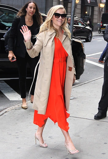 Носить яркие цвета весной и летом хочется многим, однако далеко не все готовы привлекать к своему наряду слишком много внимания. Риз Уизерспун, например, выбирает самый удачный прием, чтобы этого избежать. 29 мая актриса отправилась на шоу «Доброе утро, Америка», где рассказывала о новом сезоне сериала «Большая маленькая ложь», одного из самых крупных проектов телеканала HBO. Для эфира актриса выбрала яркое платье A.L.C. длины миди и успокоила броский оттенок базовым песочным тренчем и босоножками с прозрачными вставками от Tamara Mellon.