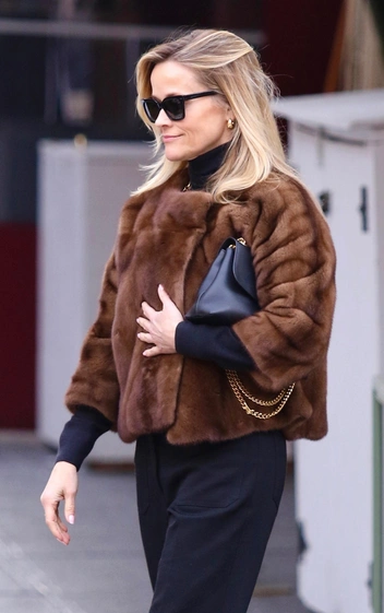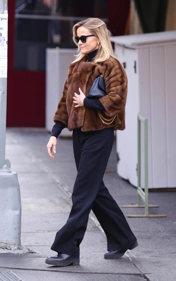 Риз Уизерспун примеряет самый элегантный вариант шубы 2026‑го — укороченную модель шоколадного оттенка, которая идеально вписывается в эстетику mob wife и тренд на короткие меховые жакеты вместо громоздких длинных пальто. Она сочетает ее с черным аутфитом: водолазкой, широкими брюками и массивными ботинками, добавляя лишь лаконичную кожаную сумку с цепочкой — в итоге мех работает как главный акцент, а весь образ выглядит одновременно повседневным и по‑голливудски роскошным.