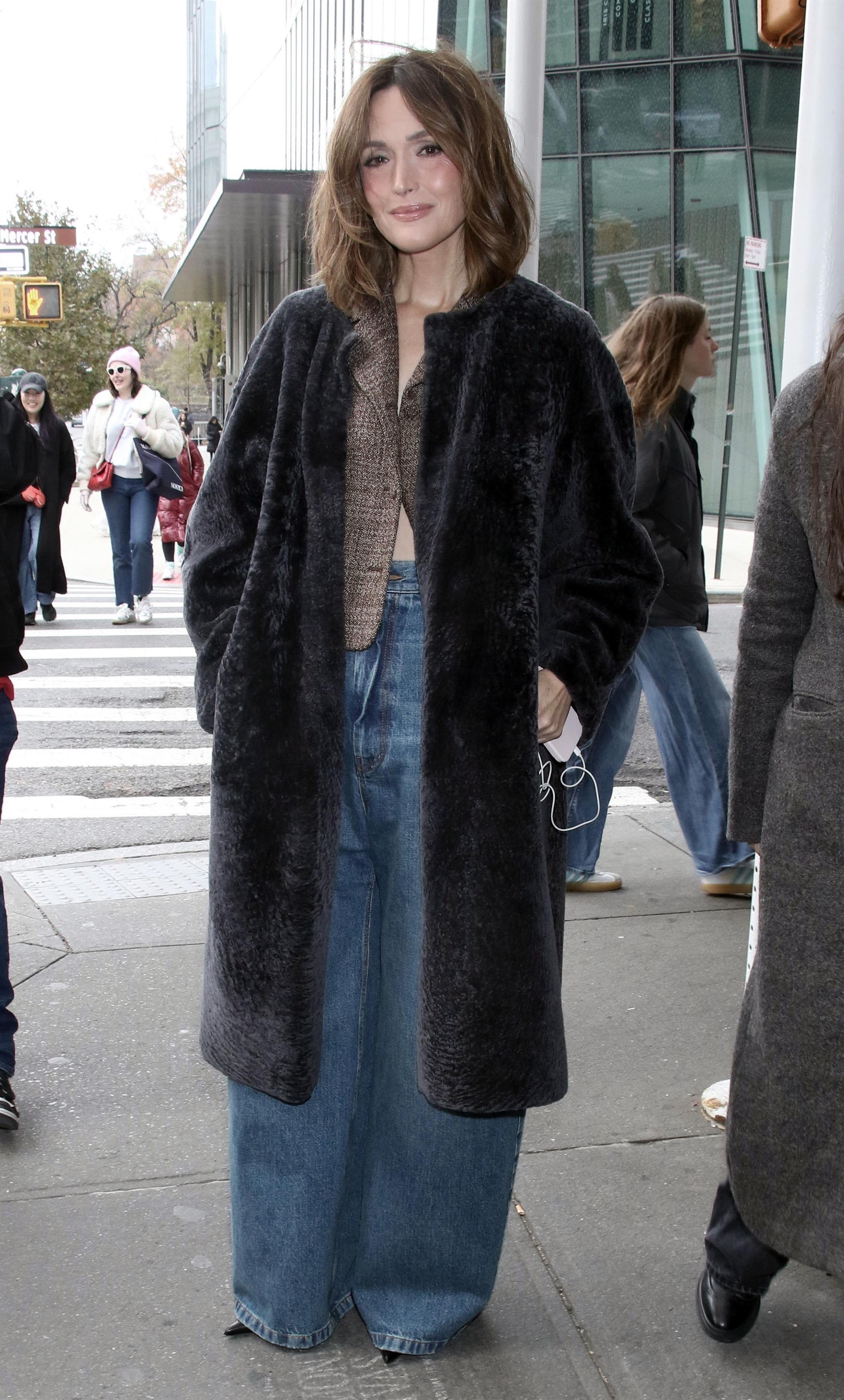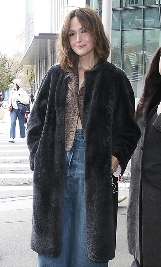 Роуз Бирн выбирает расслабленный городской шик для прогулки по Нью-Йорку, и ее стиль будто специально создан для осеннего мегаполиса. Главный акцент — роскошная темная шуба прямого кроя, которая моментально добавляет актрисе статусности и нотку винтажного настроения. В качестве основы — объемные джинсы на низкой посадке и твидовый жакет, создающий приятный контраст фактур. Такой микс денима и мягкой шерсти выглядит свежо и современно: Бирн уходит от формальности, но сохраняет утонченную женственность во всем образе.
